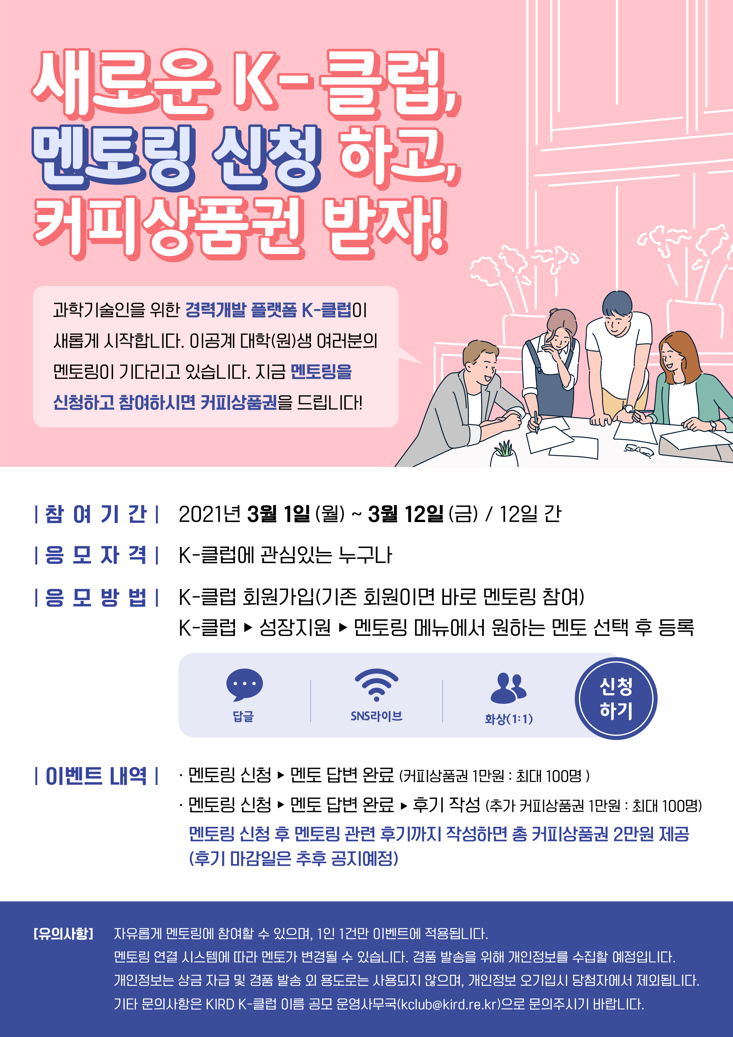 행사안내 홈으로 공지사항 행사안내 홈 공지사항 학과소개 학사정보 공지사항 English Introduction 행사안내 학부 대학원 행사안내 공유하기 인스타그램 페이스북 X(트위터) 유튜브 프린트 행사안내 상세보기 - 제목, 내용, 파일, 조회수, 작성일 정보 제공 [KIRD] 이공계 대학(원)생 경력개발 온라인 멘토링 작성일 : 2021-03-04 조회 : 205 🔗 짧은 주소 보기(Beta) 파일 jpg 문서 K-클럽 멘토링 이벤트 안내(웹 포스터).jpg 목록 게시물삭제 광고 반복작성 욕설 본인삭제 게시물삭제 이전글 상반기 교육재능 기부자 모집 안내 다음글 제 3 차 환경교육 종합계획 공청회
