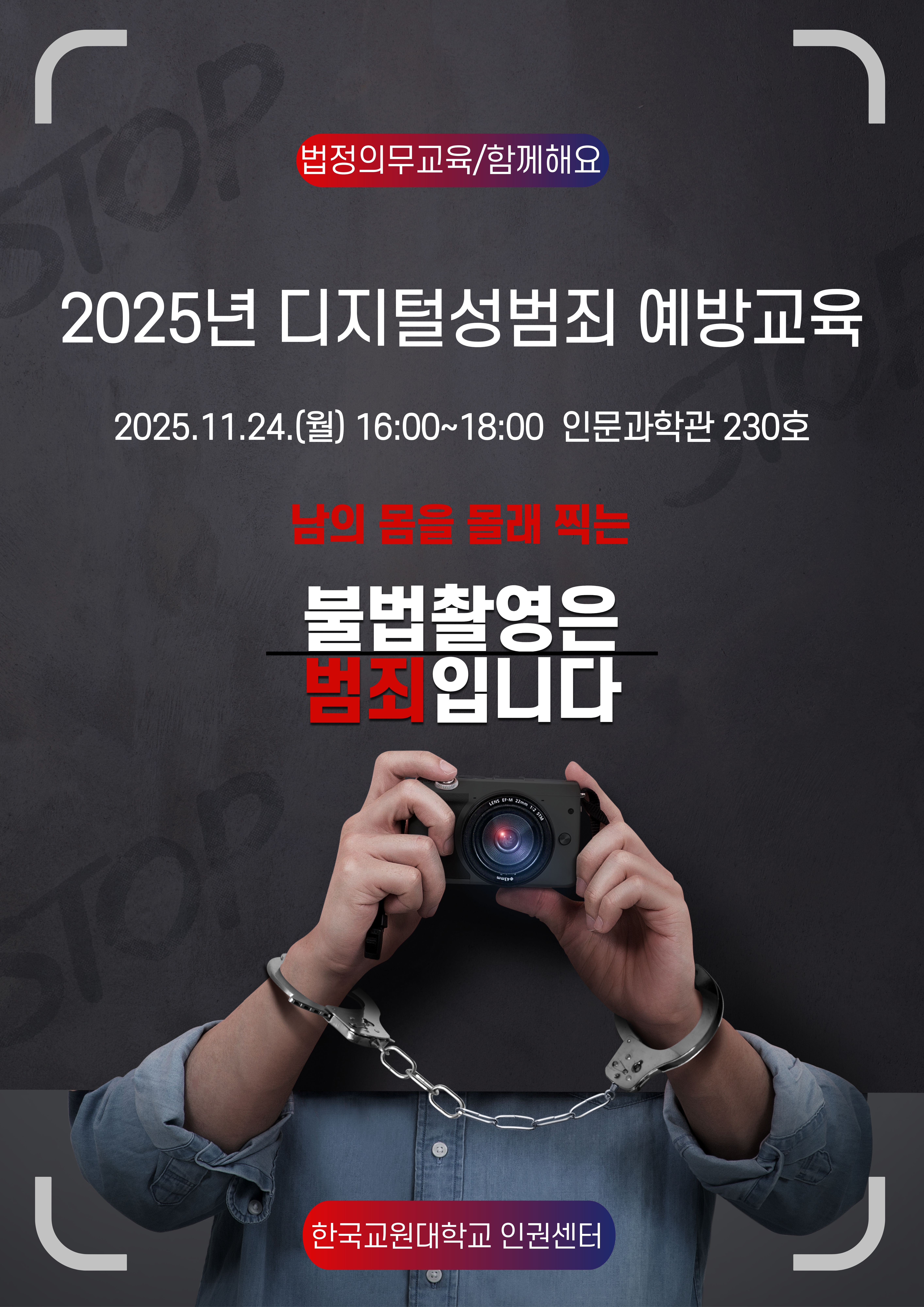 가. 교 육 명: 2025년 디지털성범죄 예방교육 나. 교육대상: 재학생 전체(대학원생 포함) 다. 신청방법: 사전신청(학생역량통합관리시스템) 및 현장 접수 라. 일 시: 2025.11.24.(월) 16:00~18:00 마. 장 소: 인문과학관 230호 바. 내 용: 가해자 법적 처벌 내용, 무심코 단 음란성 댓글(통매음) 처벌사례, 피해자 삭제/법률 지원 방법, 범죄 동기 및 실태 분석, 교제폭력 및 스토킹 피해예방 등 사. 강 사: 곽미경 경감(대구남부경찰서 여성청소년 계장) 아. 협조사항:(학과 및 부서) 소속 재학생 대상 교육 참여 적극 안내(붙임파일 활용) 등 ※ 교육 참여자: 사도교육원 상점 1점 부여, 비교과 마일리지 2점 인정 끝. |
