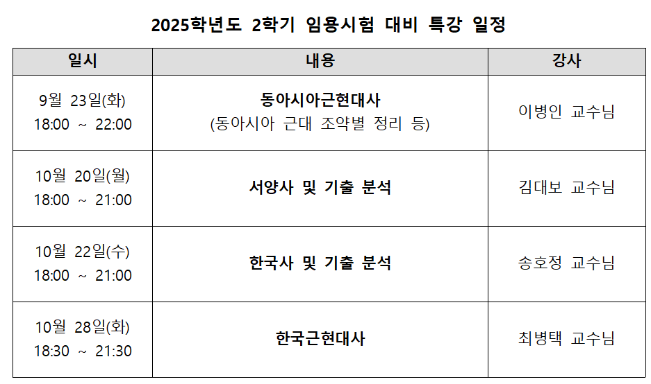 1. 동아시아근현대사 / 이병인 교수님 - 일시: 9월 23일(화) 19:00~22:00 - 장소: 종합교육관 413호 - 내용: 동아시아 근현대 조약별 정리 ※ 해당 특강은 모든 학년 참여 가능하나, 특강 내용은 4학년 과정(임용준비생)에 맞추어 준비되었으니 참고 부탁드립니다.