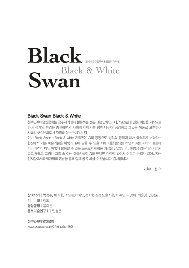 한국교원대학교 교육박물관은 지역민들에게 문화적 향유를 제공하고, 문화·예술인들의 창작 활동을 진작하기 위해‘대학 문화자원 공유사업’(국립대학 육성사업)을 진행하고 있다. 청주민족미술인협회전 “Black Swan _ Black & White”는 AI를 이용한 창작물 전시이다. 전시는 2024년 8월 22일(목)부터 9월 12일(목)까지 교육박물관 1층 기획전시실에서 진행되며, 무료로 관람할 수 있다.