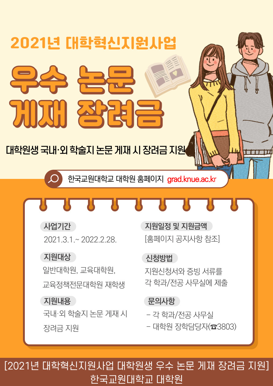 가. 지원대상: 일반대학원, 교육대학원, 교육정책전문대학원 재학생 나. 지원내용: 대학원생 국내·외 학술지 논문 게재 시 장려금 지급 다. 전년 대비 변경 내용 - 게재 예정 증명서 내 ① 논문 저자(신청자)의 이름과 소속(한국교원대학교), ② 게재 논문 제목, ③ 게재 예정 학술지(학회지), ④ 게재(발행) 예정 일자 필수 기재 - 게재 예정 증명서 제출 후 논문 게재일 기준 2주 이내로 게재 논문 사본(별쇄본)을 제출 라. 지급기준 및 금액 (단위: 천원) 구 분 지급... " |