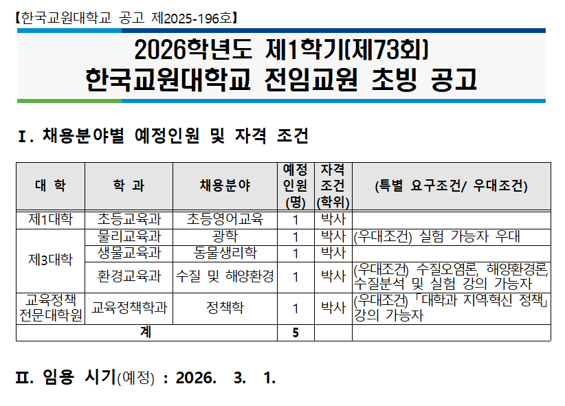 2026학년도 제1학기(제73회) 한국교원대학교 전임교원 초빙 공고 |
