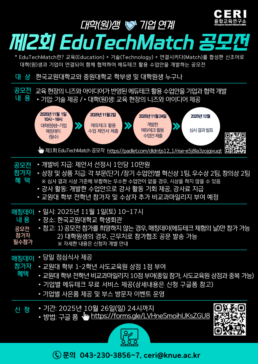 ■ 매칭데이 내용(공모전 참가자 필수참가) - 일시: 2025년 11월 1일(토) 10~17시 - 장소: 한국교원대학교 학생회관 - 자세한 내용은 신청자 개별 안내 (※ 교육대학원생의 경우, 근무학교로 참가협조 공문 발송 가능) - 참고: 1) 공모전 참가를 희망하지 않는 경우, 매칭데이(에듀테크 체험의 날)만 참가 가능 2) 대학원생의 경우, 근무지로 참가협조 공문 발송 가능 3) 제2회 EduTechMatch 참여기업 기술 소개 : https://padlet.com/dldntjs12_1/2-edu-tech-match-bz9f5w7bsmazbyi9 ※ 자세한 내용은 신청자 개별 안내